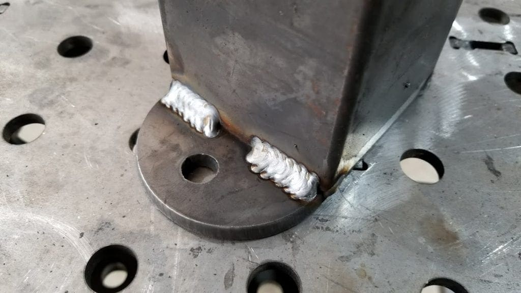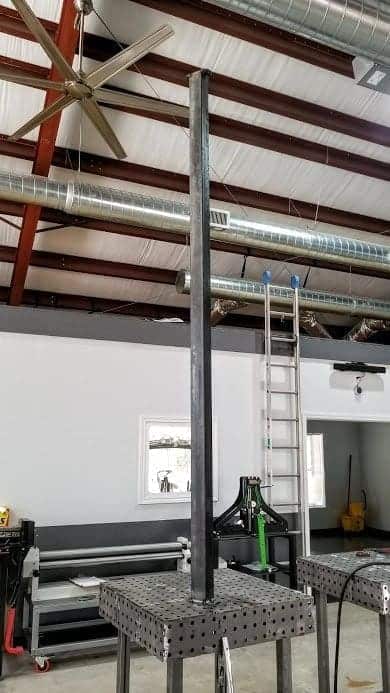 The idea was to fabricate new posts with plates on each end so they can be bolted into the concrete at the bottom, and screwed into wood at the top. So, we used the CNC machine to cut out mounting plates, which we welded on the end of 3″ x 3″ tubular steel that was cut to exactly 103″!