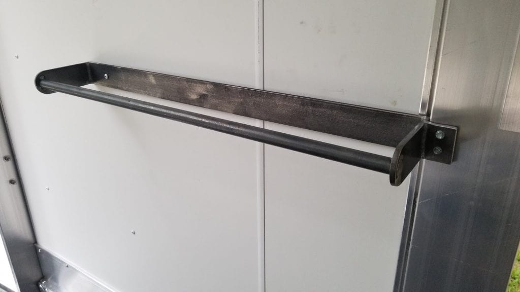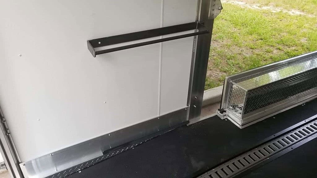 From that point, the product was fully welded and installed in the trailer. The small strip of angle iron at the bottom had the corners rounded and smoothed for safety, and was installed using three existing screws which previously just held trim in place. The top bracket was installed using an existing screw on the left, and by adding two new heavy duty screws on the right.