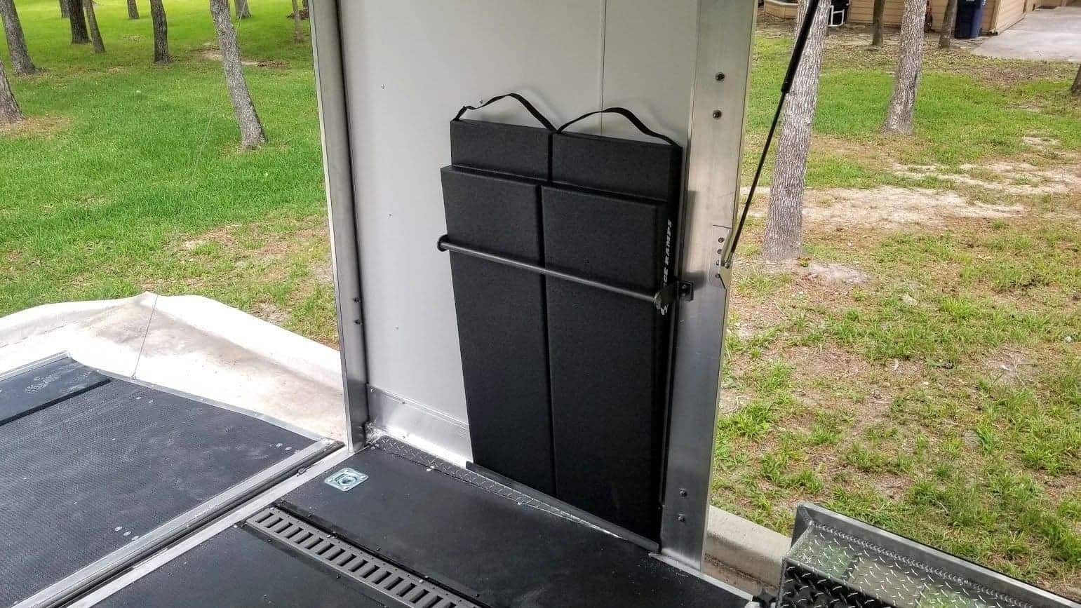 Our client had a beautiful custom car hauler, with a goal to simply accommodate the ramps in an unobtrusive spot. In addition, we wanted to avoid making new holes in the trailer if at all possible. The solution was quite simple – a small strip of angle iron at the bottom to hold the end of the ramps against the wall, and a custom rack to slide the top down into.