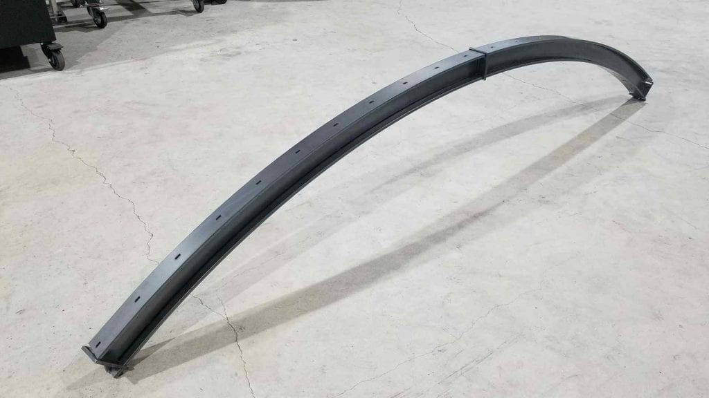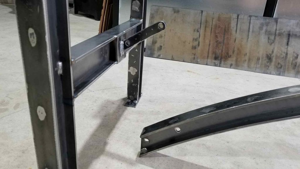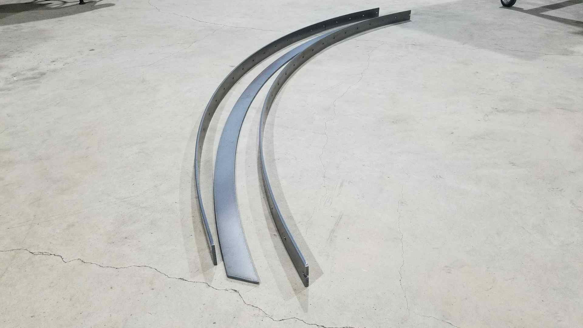 This meant we had to find a easily connect the legs on either end to the arch in the center. The answer was to create a curved mounting bracket which would allow the center section of the arch to slide into place and lock semi-permanently. Here the parts for the mount are ready for welding.