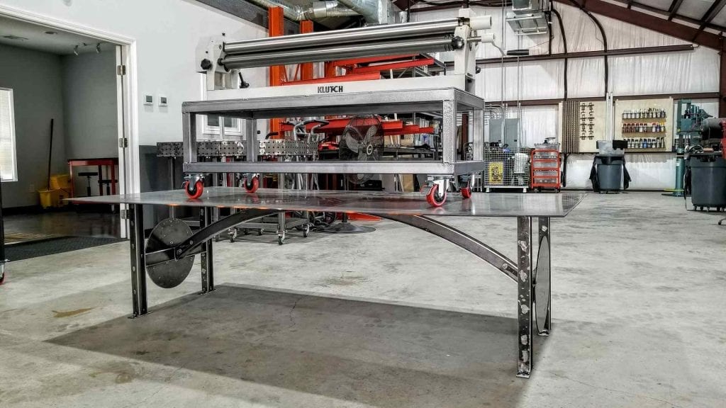 Kevin loves to challenge convention, and the design of this table base is no exception. His vision was to build an industrial I-Beam design, including an arch in the center of the table that doubles as an additional support. On top of that, he wanted 2 inch I-beams – a size that simply isn’t made!