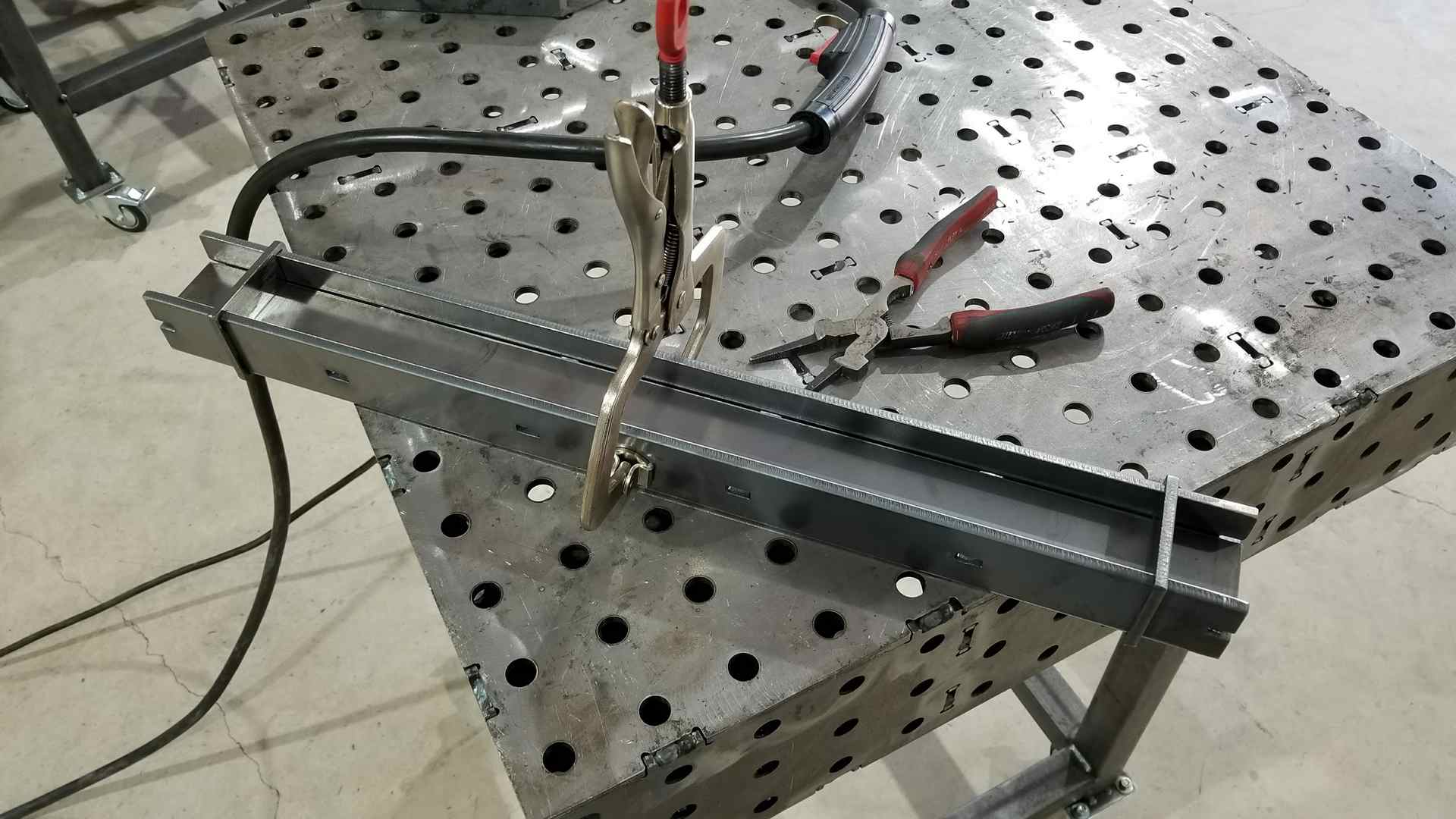 One of the goals was to make the table base appear old and worn, so I decided to weld every few inches. All in, there are over 50 welds on the top and bottom. Each of which had to be ground smooth.