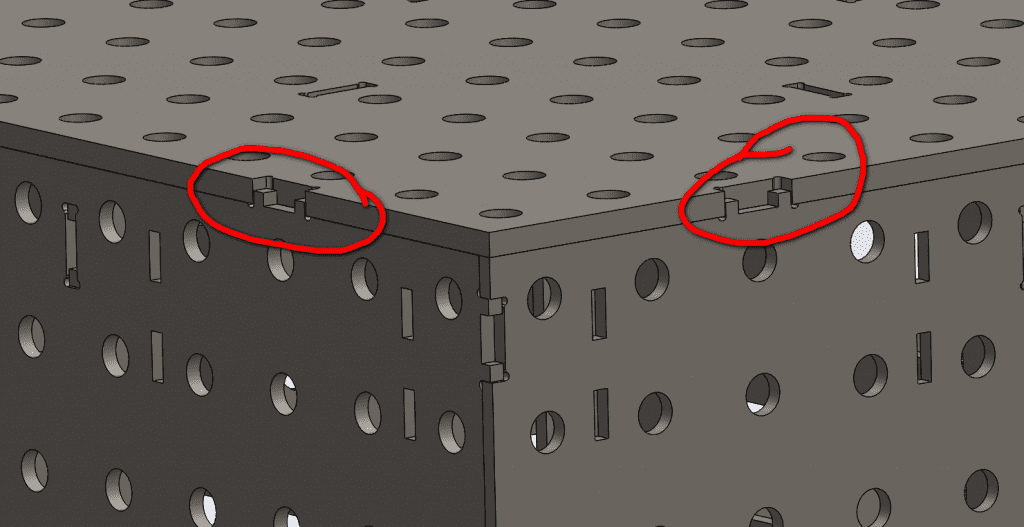 Another detail you might not catch is that ALL accessories are designed out of 1/4″ material. Here’s a little closeup of the table with a 3/8″ top on it. Note how the top sticks up where the tabs and slots are? That extra material means that if you were to add a vise mount, or a table extension, the surface of those accessories would be below the table surface.