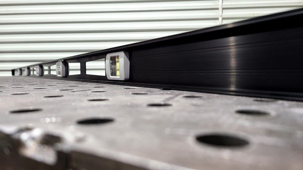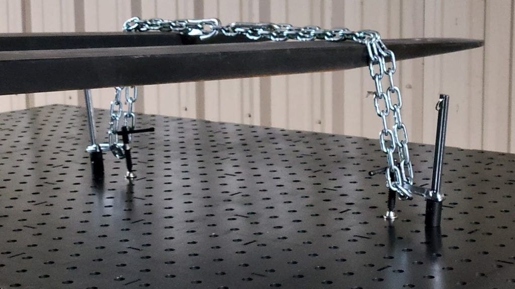 Our standard is 1/4″ plate. But let’s imagine we go with 1/2″ plate instead! Now, we have to fight the natural bow of twice the thickness of steel, which means we have to clamp MUCH tighter to achieve the same result. This also puts the entire table under more stress, and requires much more welding, which also means much more heat input, which means more expansion and potential for deformation.