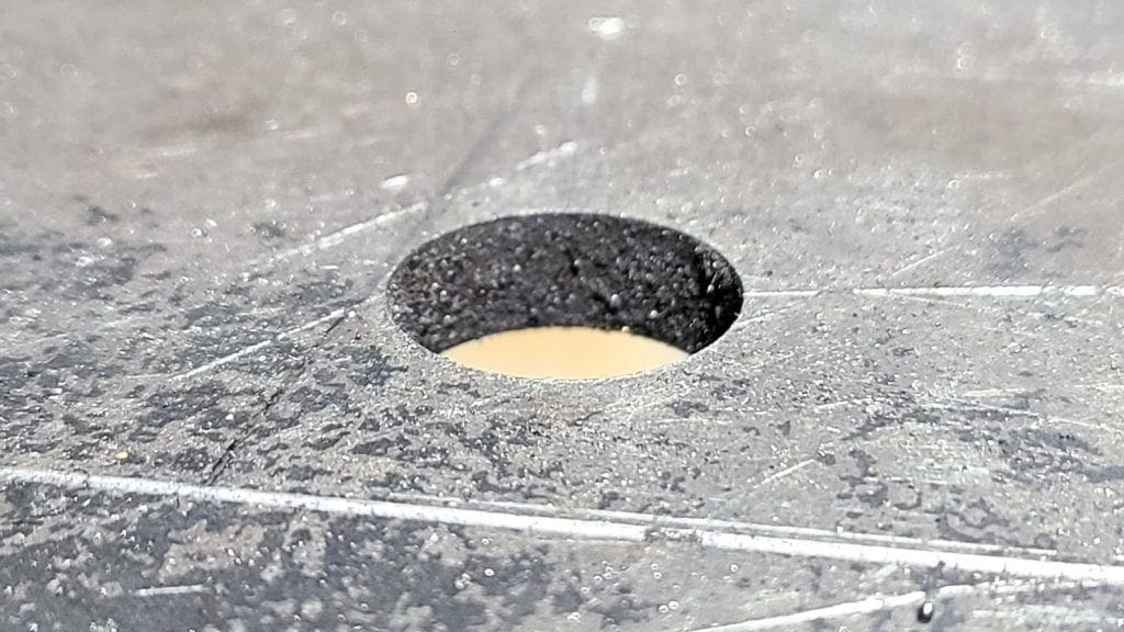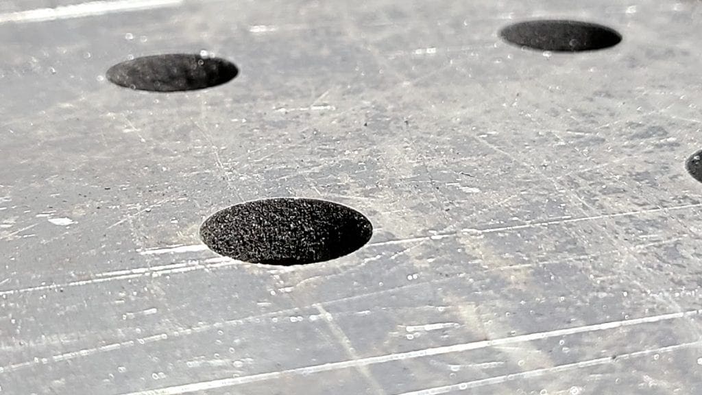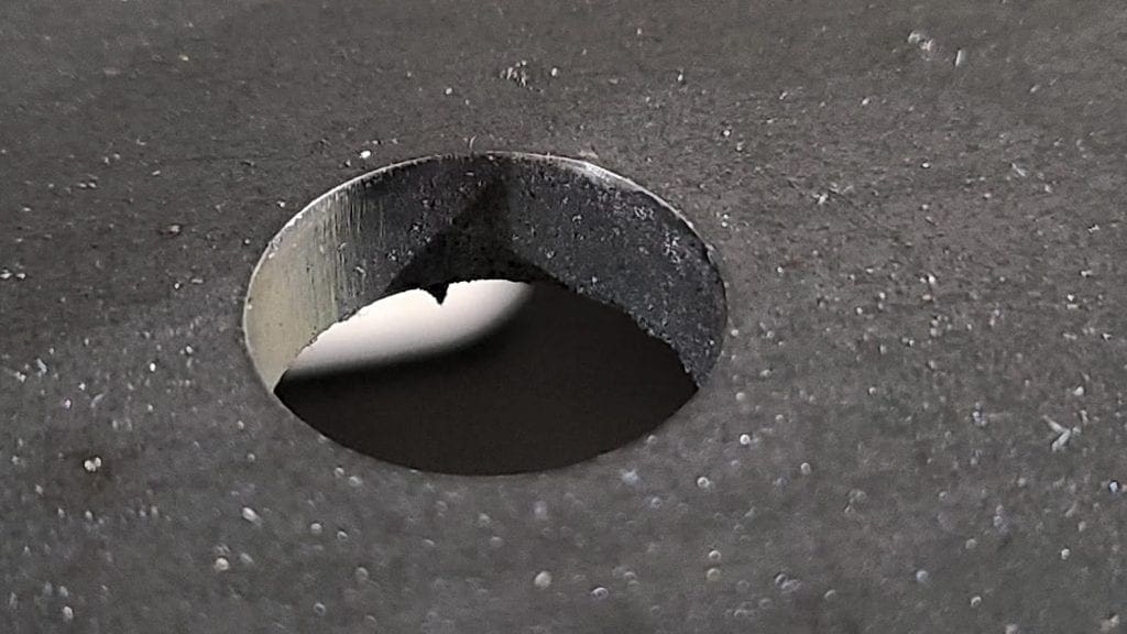 Can you spot that tiny, tiny little indentation at about 1 o’clock in the photo? It’s only at the very, very edge, and tooling in the hole is unaffected. This could even be from a previous event. And it also isn’t enough to really even feel. The dirt on the table is easier to feel, and a weld BB getting stuck on the edge of, or inside a hole is much worse. So why was Jason able to feel his deformation and file it down so easily?