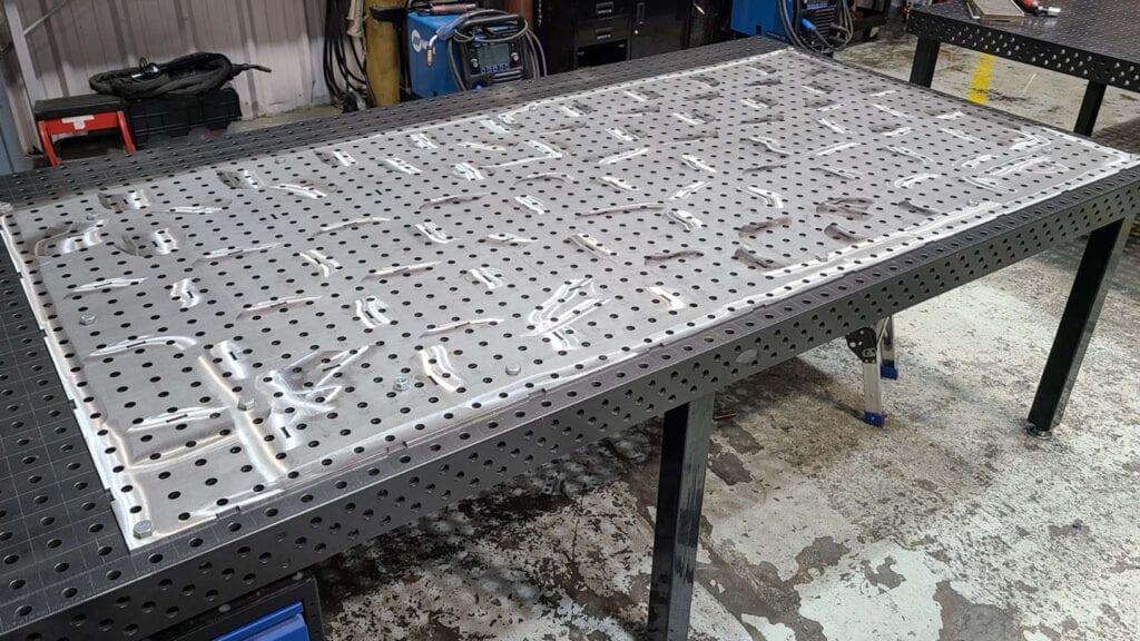 However, now that the new table top is bolted to a known flat surface, when we squeeze the ribs down onto it if there happen to be any gaps they get locked in place when we weld. Which leads me to one other point – when we do the welding, we place 8 small welds in each 10″ square section of table. So on a 50″x100″ table such as the one in the photo above, there will be over 400 welds holding everything together once it’s all said and done.