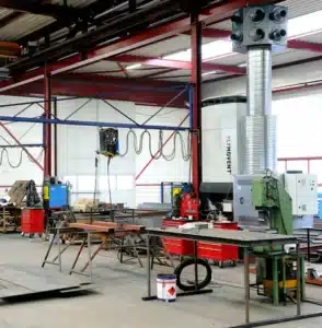 But there’s another reason the columns and uprights need to be beefy – when it’s time to deal with fume extraction, lighting, or even bolt on welding surfaces, you need the entire structure to not only be strong enough to hold it, but strong enough to hold it rigidly even while you’ve got multiple welders in attached booths all yanking on fume extraction arms, beating on welding surfaces, and whatever other crazy things fabricators routinely do!
