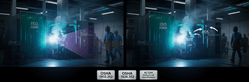 - ISO 25980 (curtains and screens): Defines attenuation and labeling for transparent welding curtains, strips, and screens.