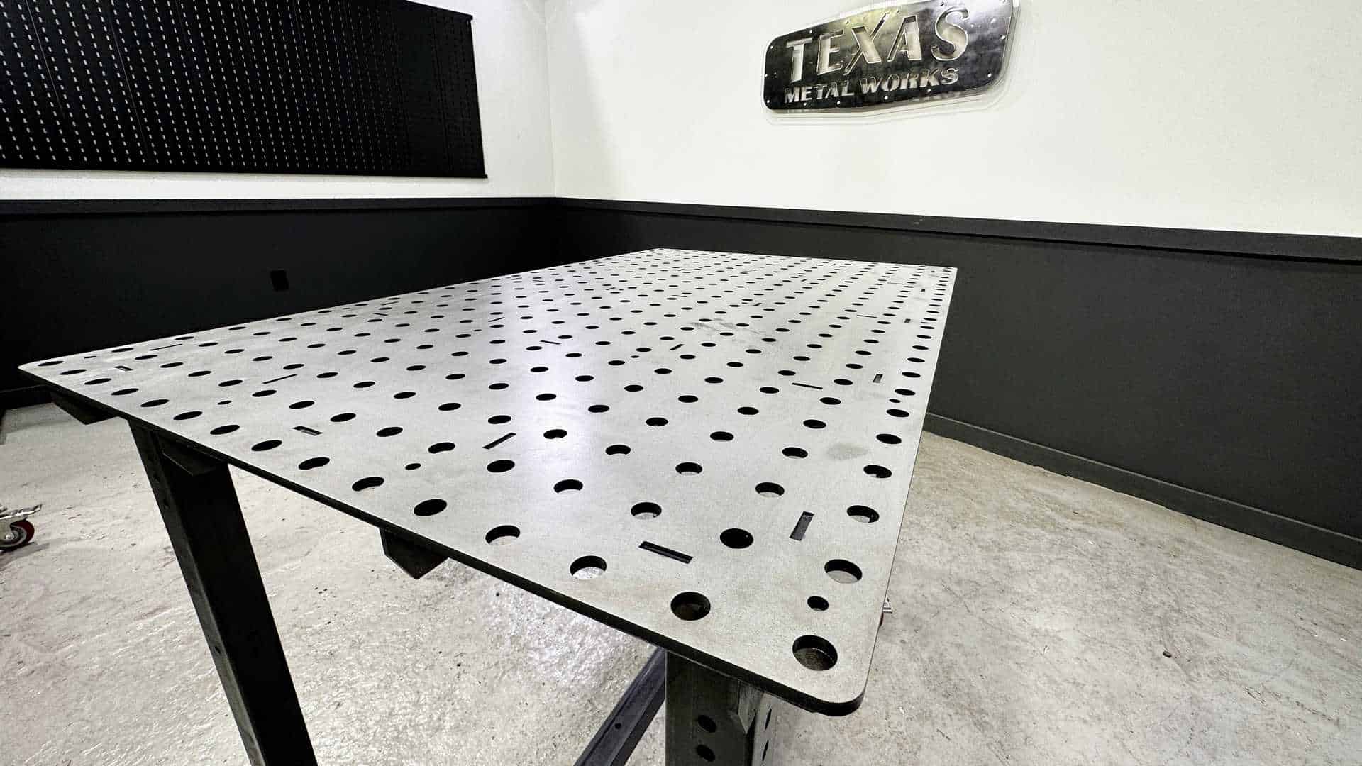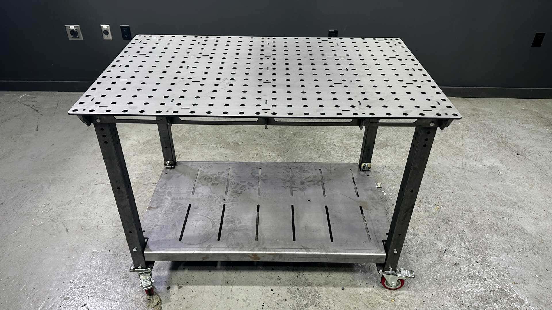 We have two variants of this table: Version 2 (3/16″ Top with 5/8″ holes spaced 4″ apart) and Version 3 (1/4″ Top with 5/8″ holes spaced 2″ apart). PS: 30″ x 48″ Welding Table DIY Kit Fully Assembled! (Version 3 – 1/4″ Top)