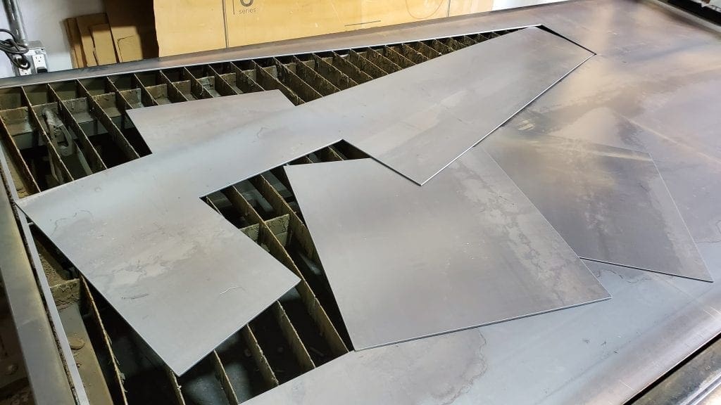 These fire pits are CNC cut from heavy 10 gauge steel plate. They come off the robot in several pieces which then have to be hand assembled.