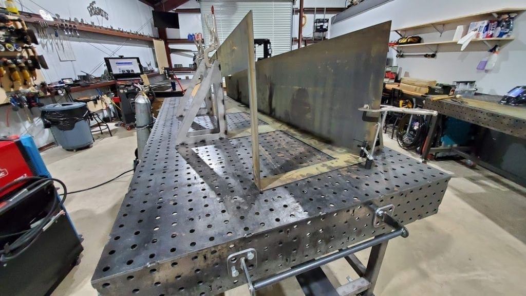Each piece is laid out and clamped securely to a fixture welding table to ensure perfect alignment and flatness.