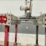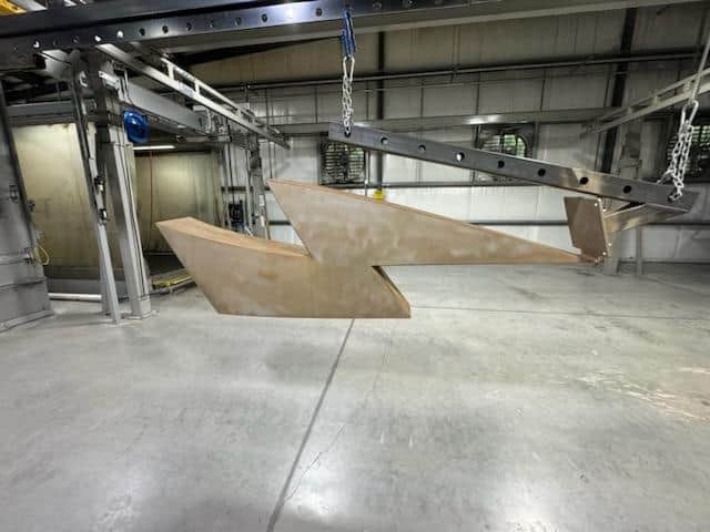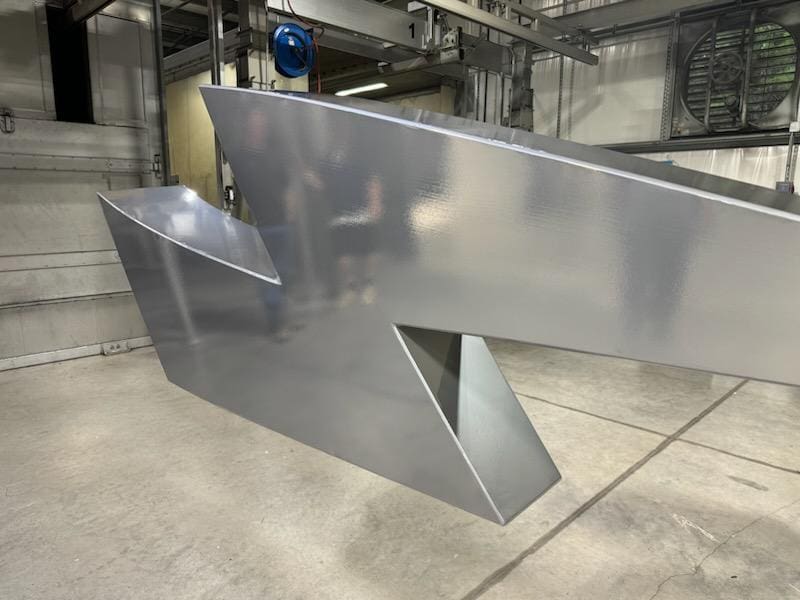 Once the final welding is done, the entire surface is sanded and all edges ground smooth. At this point a specially designed hanging jig was bolted onto the bottom to allow the art to hang horizontally with only an attachment at the bottom of the base to allow for powder coating.