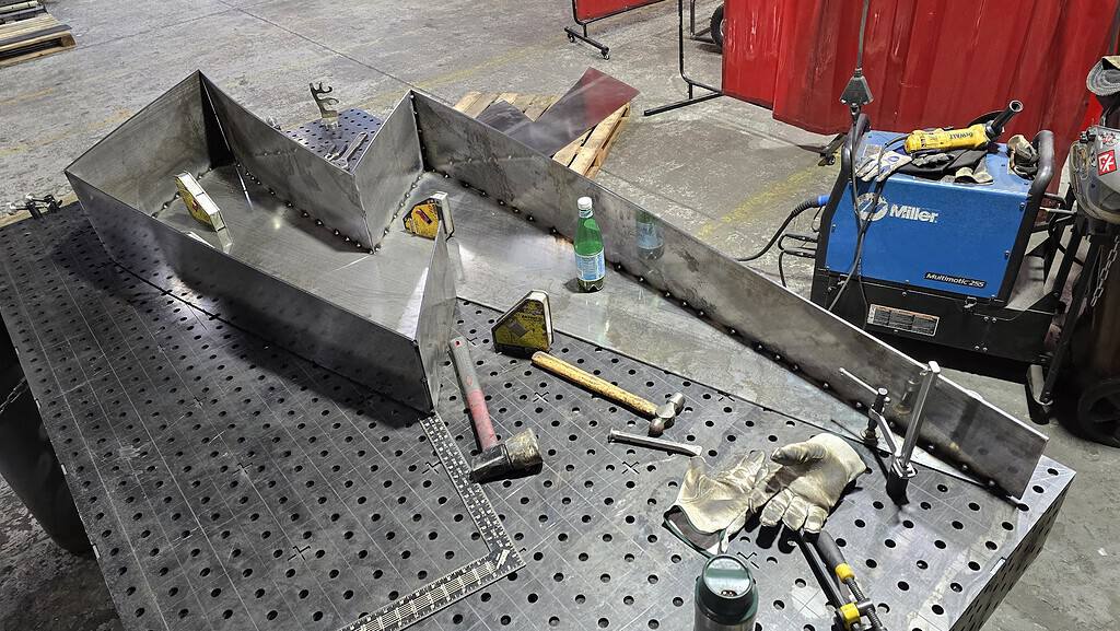 The parts are all fixtured to a special table to ensure flatness and perpendicularity, and meticulously fitted and tacked together.