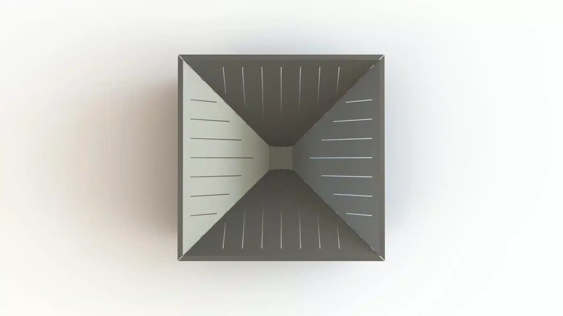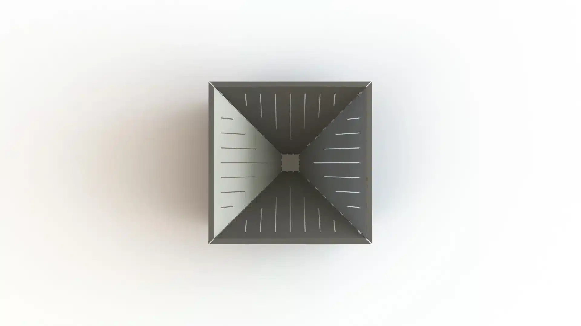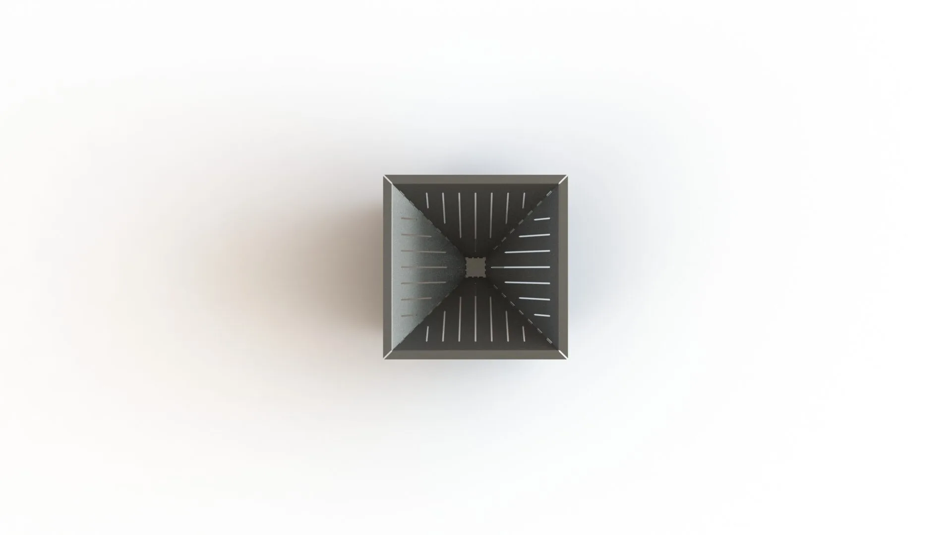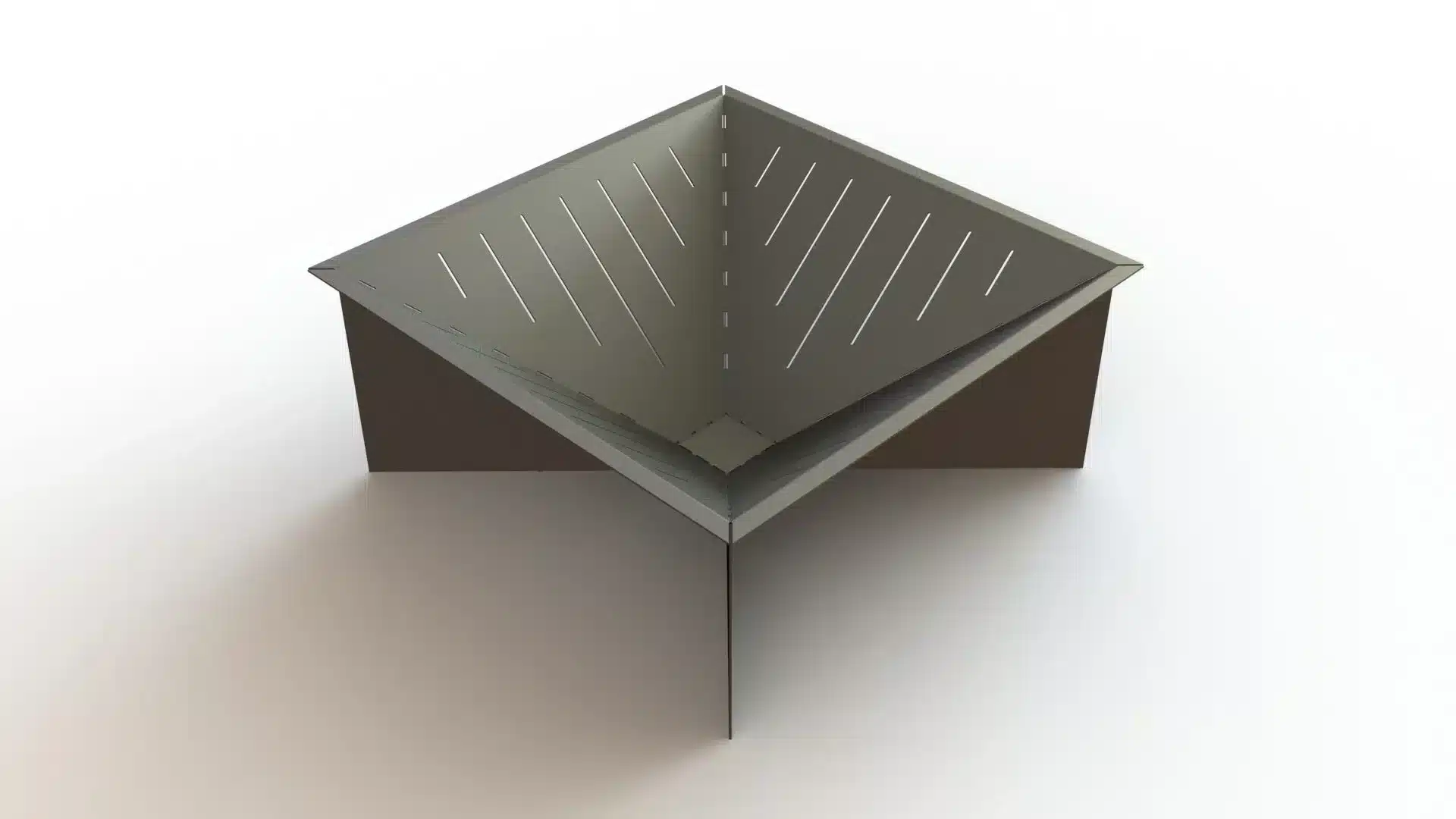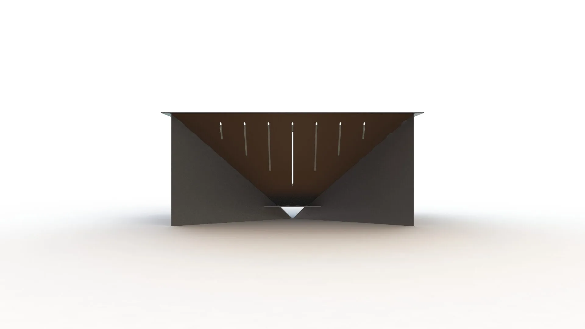 Meet the GEOMA Firepit: a striking, inverted pyramid design crafted from 11ga steel. Four sloping triangular panels converge downward to create the fire chamber, while a set of supports extend from each seam to the ground forming an X-shaped base from corner to corner—a clever structural twist that balances both form and function. Air slots are cut into the panels to keep the fire well-ventilated, ensuring a robust, long-lasting burn.