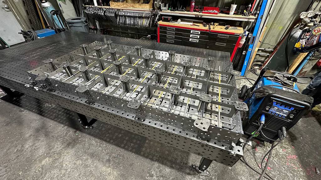 Only after securing the top to a reference surface do we add the ribs and sidewalls and secure them by bolting everything firmly in place before locking it in with hundreds of weld points.