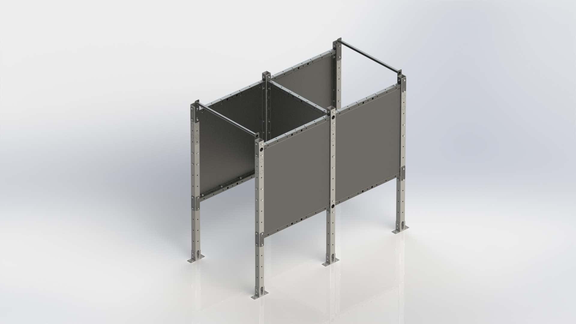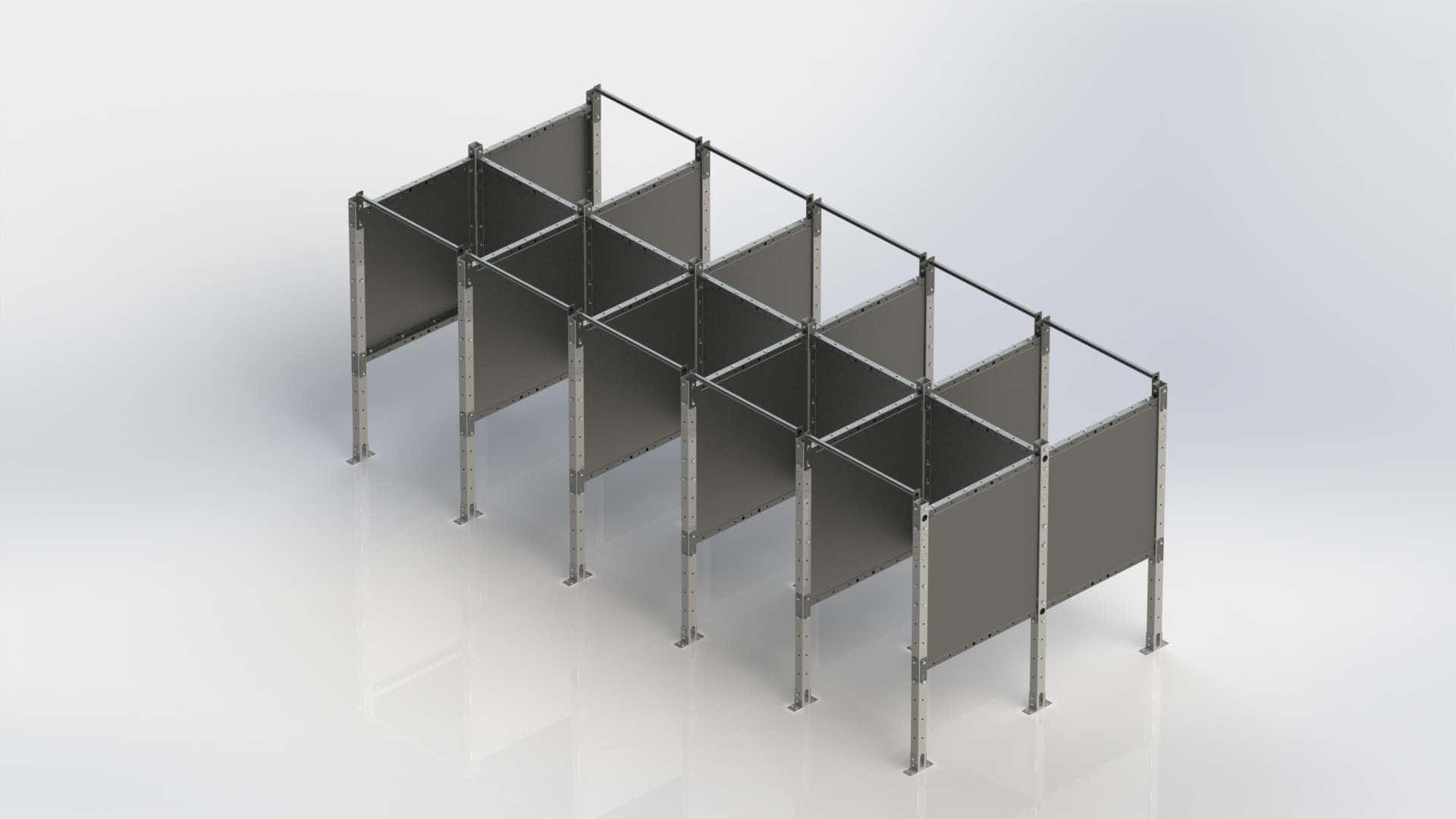 • Columns: We utilize heavy-duty 3″ square tubing uprights at each corner of every station, plus additional uprights in the center of any span over 8 foot long for strength, and to allow for future expansion.
