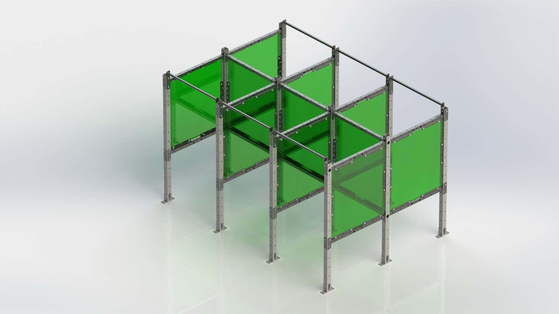 This 4'x4' ModPro Welding Booth configuration is for back-to-back rows of welding booths. These booths are arranged both side by side and back to back, coming in pairs. Shared components save around 30% or more.
