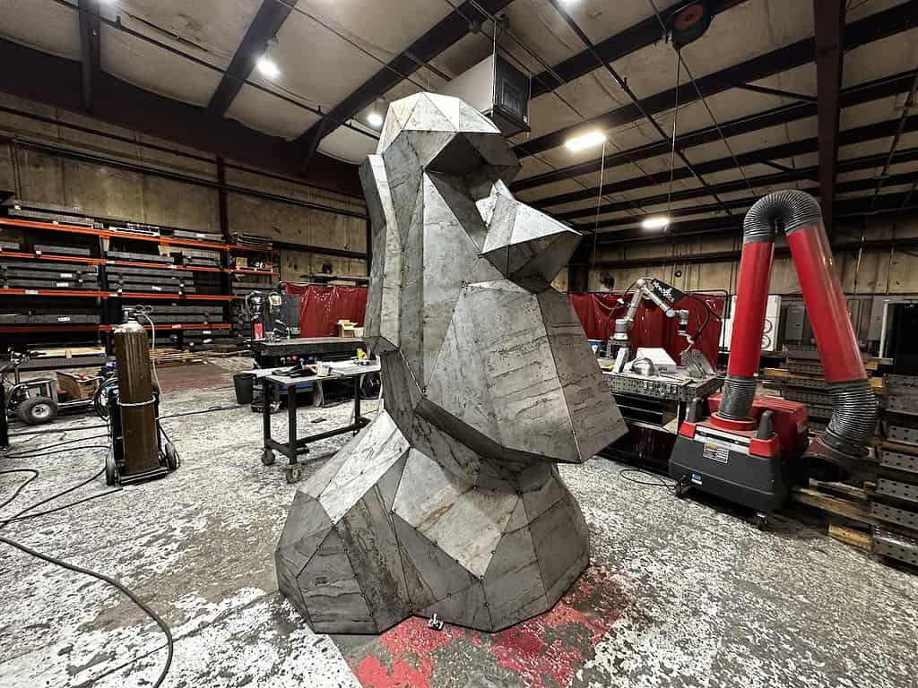 During fabrication, all 78 distinct panels were meticulously seam welded to form the head. All in, the amount of continuous welding to build the 10′ tall sculpture would stretch the length of two football fields! The sculpture also features internal cross bracing for additional strength.