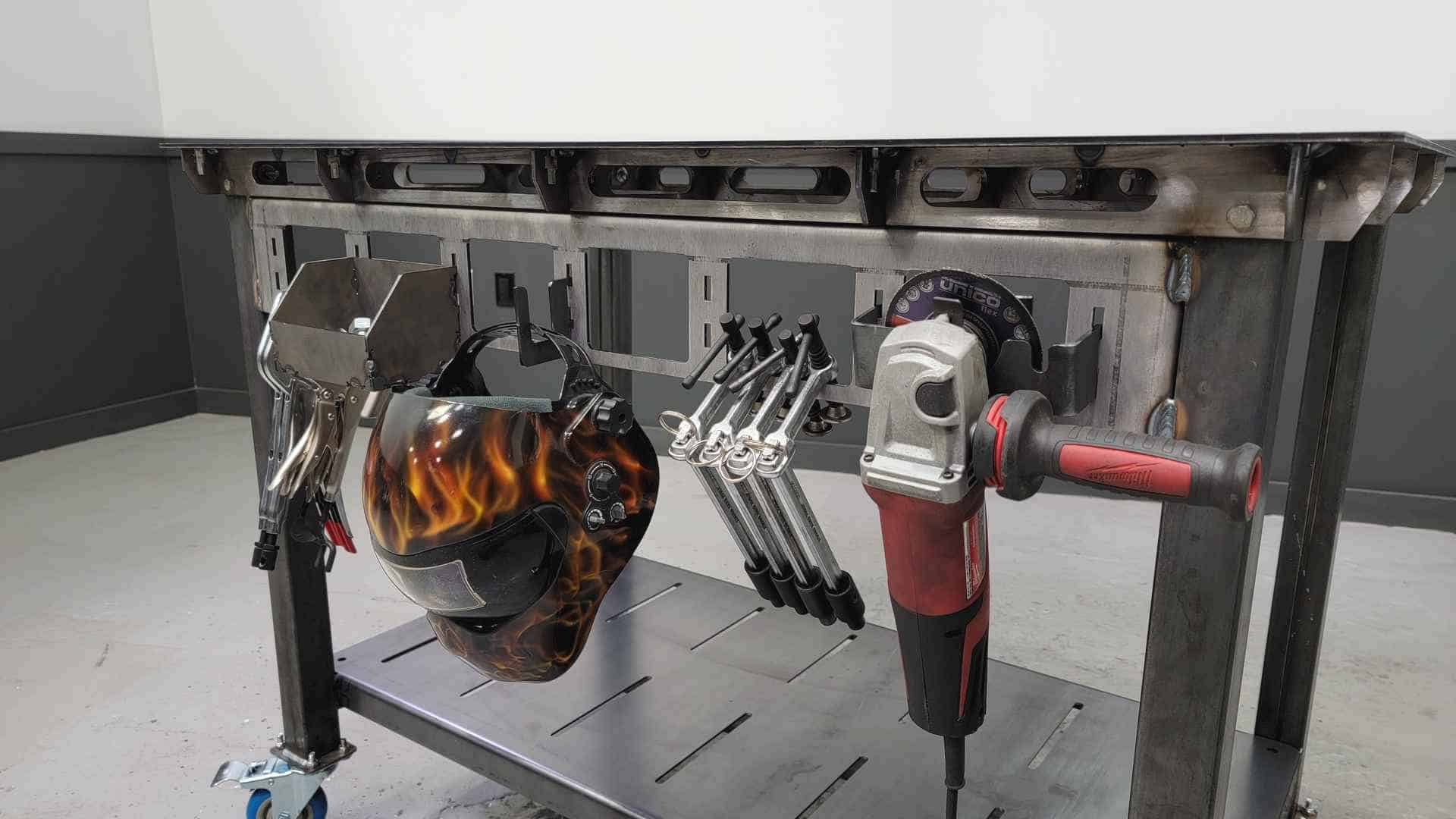 Our Super Slot Grinder Hanger adds storage to our 2nd generation tables and our Super Slot Panels.