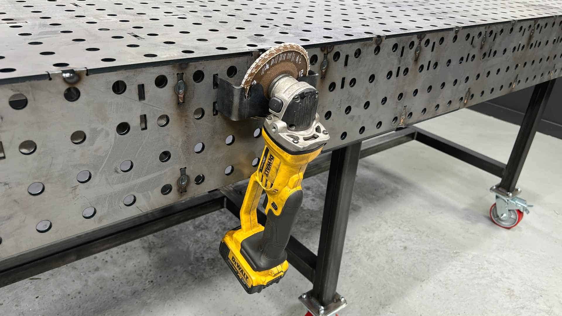 Laser cut and CNC bent from 10 gauge steel, our Super Slot Grinder Hangers are made to hold 4.5″ grinders nearby when you need them.