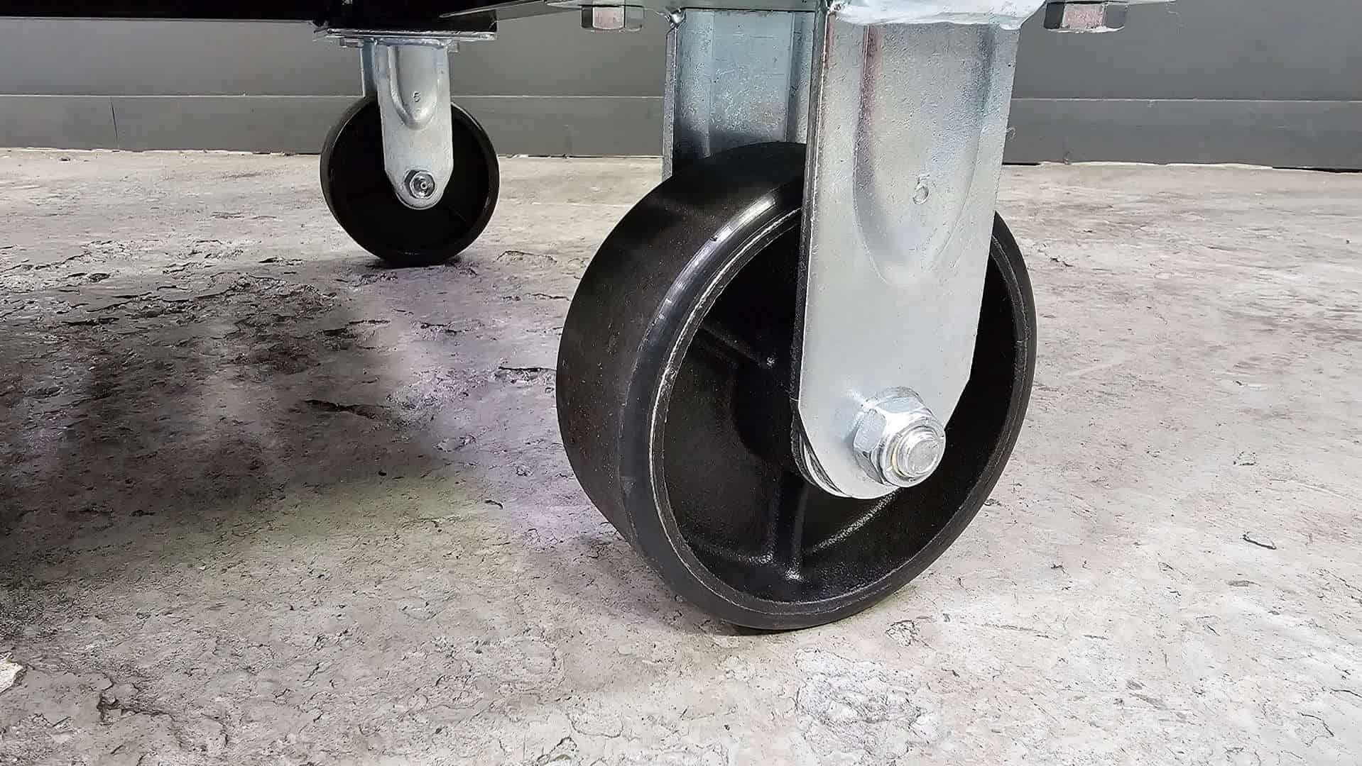 • 5″ poly on steel total lock casters rated at 800lbs each.