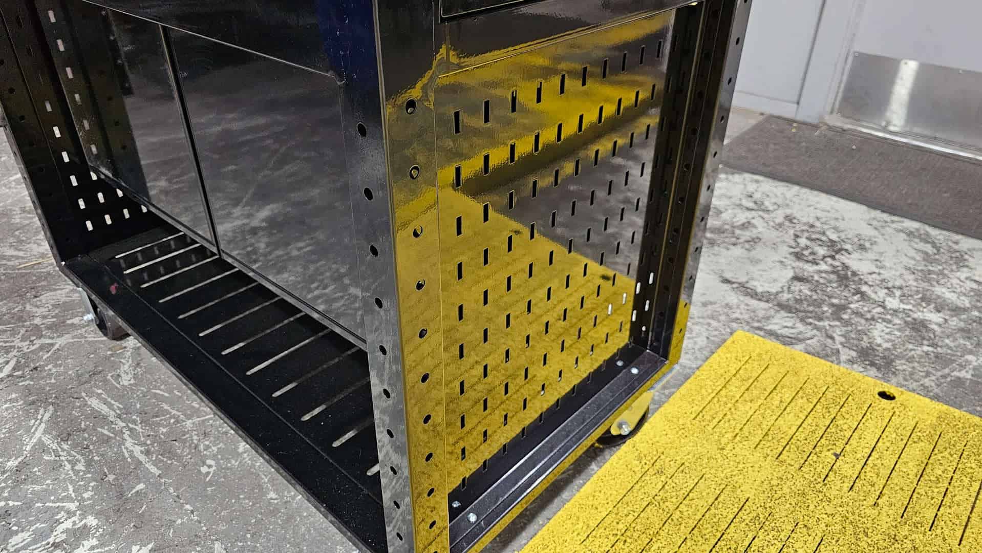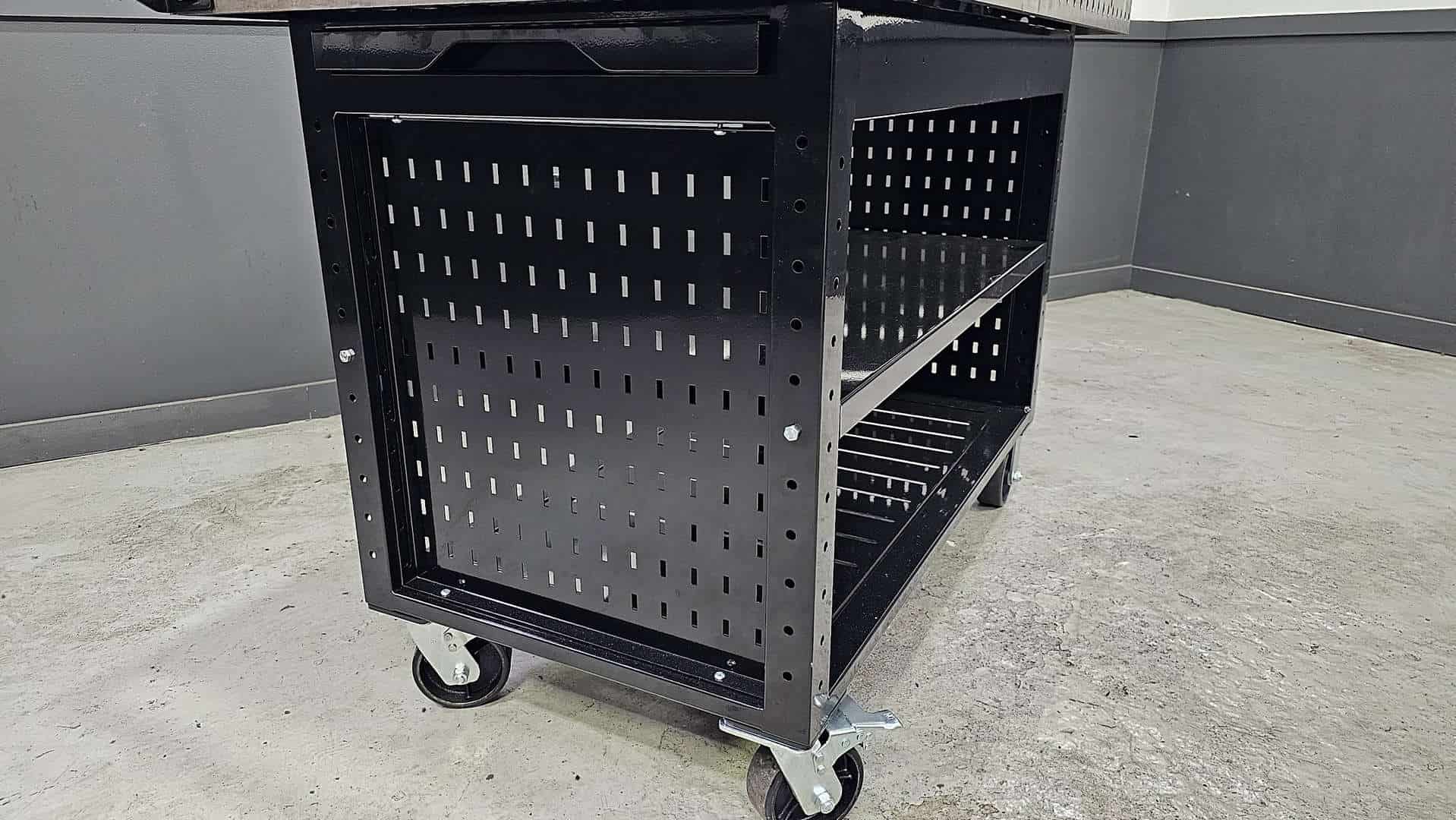 Of course Wolfram comes with a lower shelf in even the basic configuration. We cut this shelf out of 14ga steel, and reinforce it with cross bracing underneath. It starts out on our laser where we profile the panel and cut 24 slots that can be used for securing just about anything to the shelf. It then makes its way to our CNC brake where we bend flanges on all 4 edges to provide strength and rigidity. Finally, it’s welded inside the frame. When it’s all done, not only is it beautiful – it’s incredibly strong!
