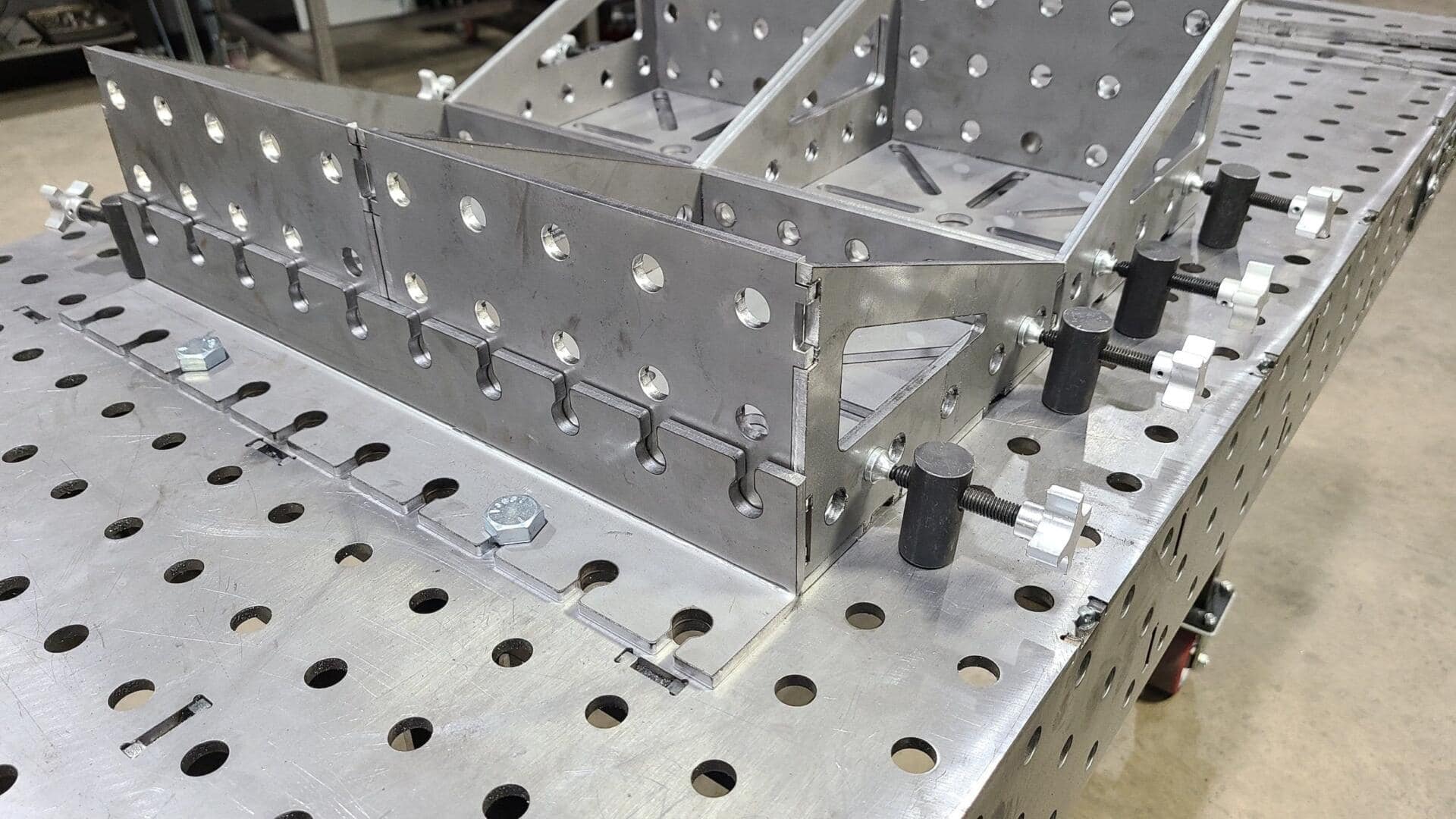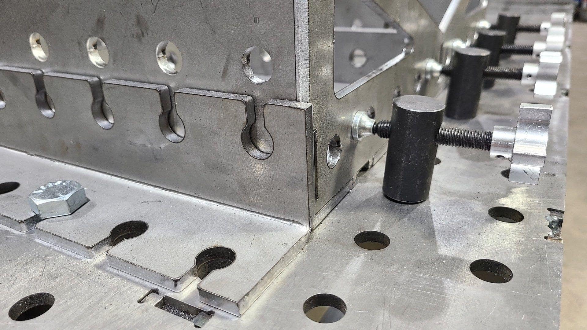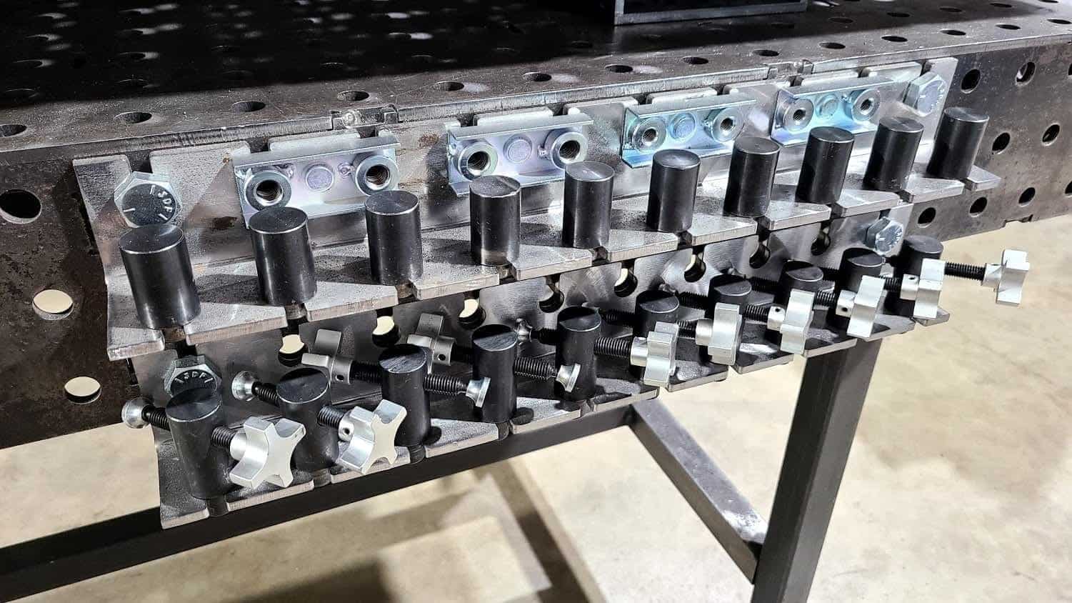 If you stop by our shop you’ll see a pair of these Accessory Hangers on each of our tables to hold ten of our BuildPro 1.5″ Stops and ten of our BuildPro Welding Table Side Clamps. Look close and you’ll also see the magnetic Threaded Hole Adapters! Of course, you can store any tooling that fits 5/8″ / 16mm holes, and you certainly don’t have to mount them above one another. You could place them side by side, or even keep some on each side of the table!