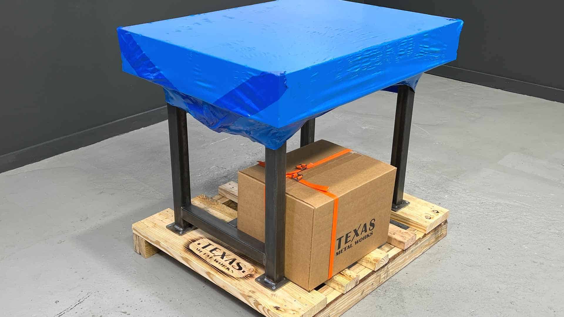 Each table is bolted directly to a custom pallet with heavy-duty hex head screws to ensure it stays put during transport. If you choose the option with casters or purchase accessories, they’ll be placed in a box and safely strapped to the pallet.