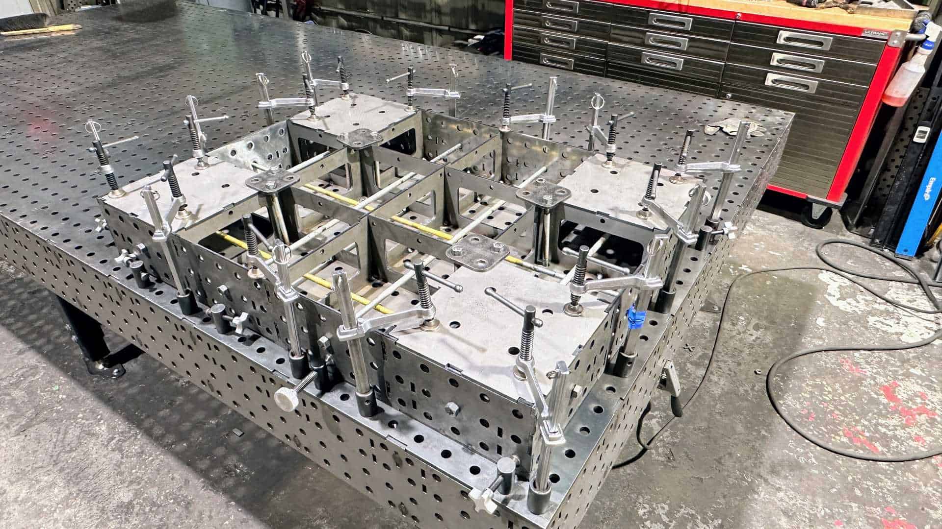 Only after securing the top to a reference surface do we add the ribs and sidewalls and secure them by bolting everything firmly in place before locking it in with hundreds of weld points.