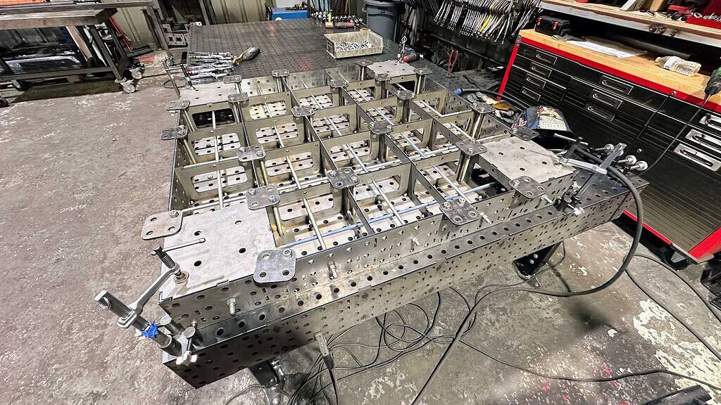 Only after securing the top to a reference surface do we add the ribs and sidewalls and secure them by bolting everything firmly in place before locking it in with hundreds of weld points.