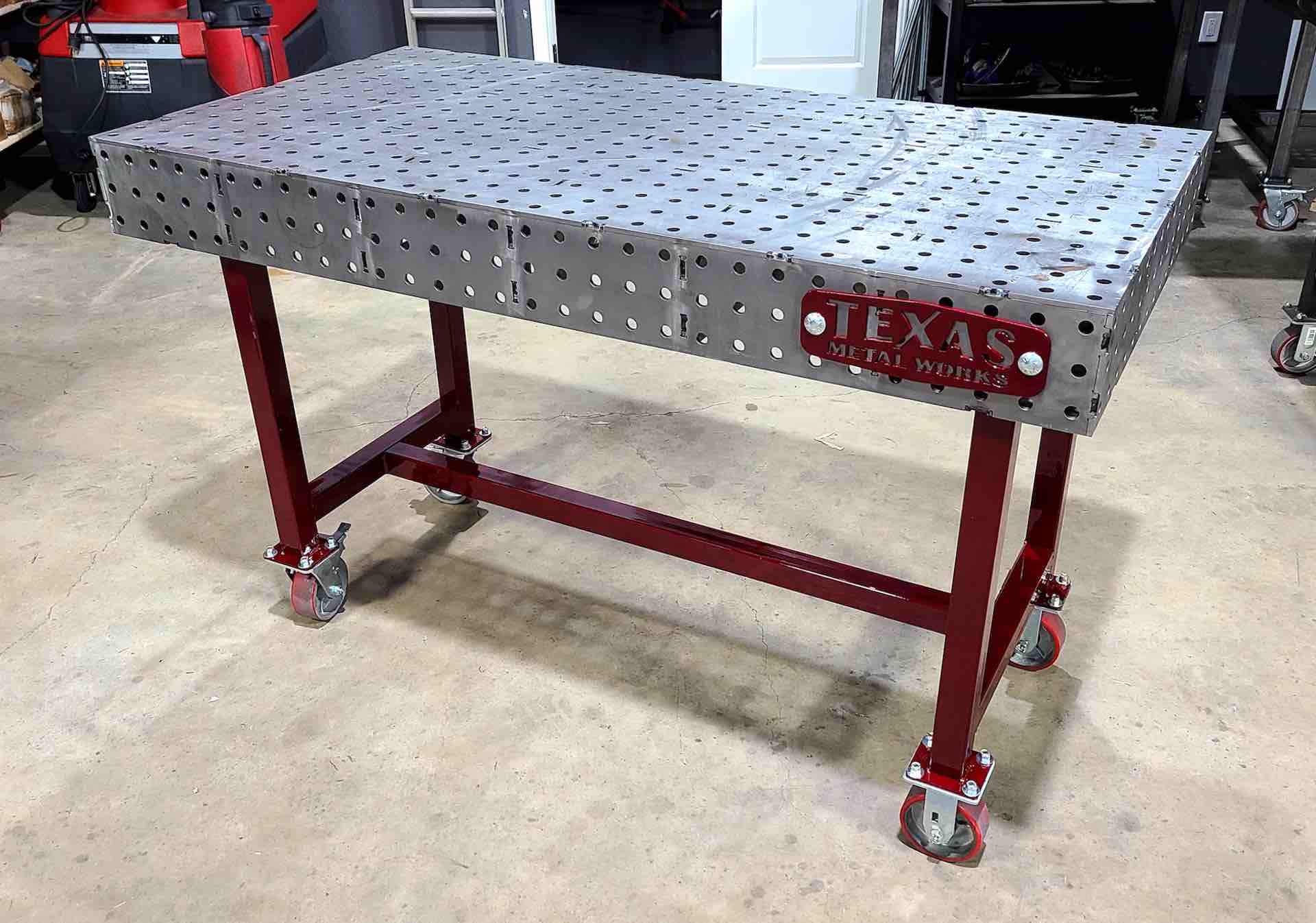 Our powder coating option adds color and depth to our tables while protecting key parts from rust. This option includes powder coating the table base (legs or legs & base shelf), Texas Metal Works’ badge and optional Welding Table Accessory Handles (if purchased separately).