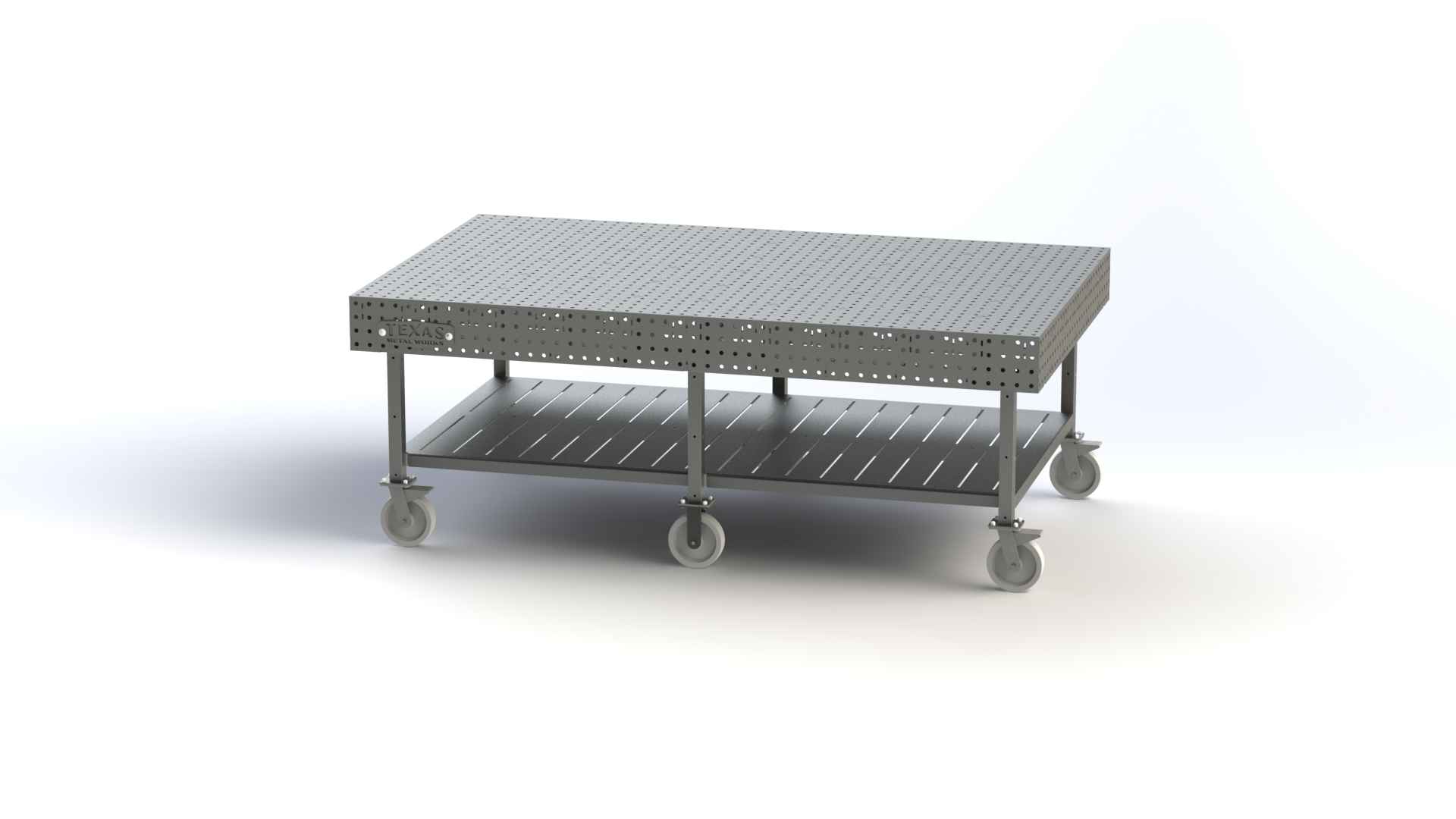 Made exclusively for our 30″ x 100″ welding table, this 10 ga base shelf has a total 36 precision CNC cut slots (5.3″) across two panels and multiple pre-drilled holes for mounting to the table’s cross braces. The two shelves share the middle cross bar and have two bends across their broadsides that drop 2″ to strengthen the cart and base shelf. Drop the shelves onto their table’s 2″ tubular base and you’re ready to go. For added stability, use the holes to screw the top to the cross braces or weld the base in place.